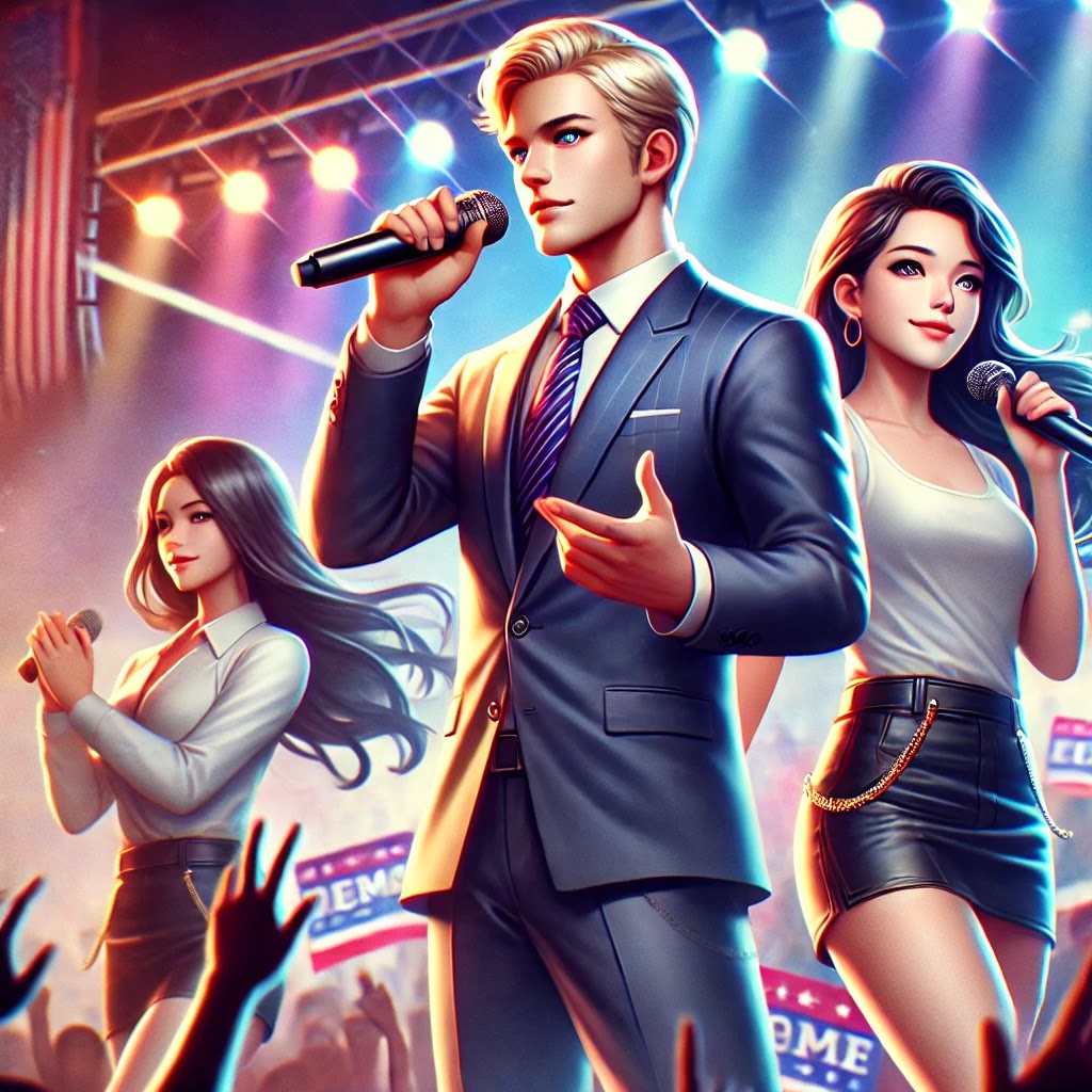 這場演唱會在社交媒體上引起了極大的關注,門票開售後瞬間售罄。場內座無虛席,場外黃牛更是將票價哄抬到天價,人潮幾乎癱瘓了整條街。當總裁站上舞台,燈光聚焦在他身上,音樂響起時,現場一片歡呼。總裁渾厚的嗓音在會場迴盪,感染了在場的每一位觀眾,讓人們不禁隨著音樂起舞。這場造勢活動的高潮時刻,他在激昂的音符中喊出選戰的口號:「讓我們一起創造一個更加包容的未來!」台下觀眾熱淚盈眶,掌聲雷動。